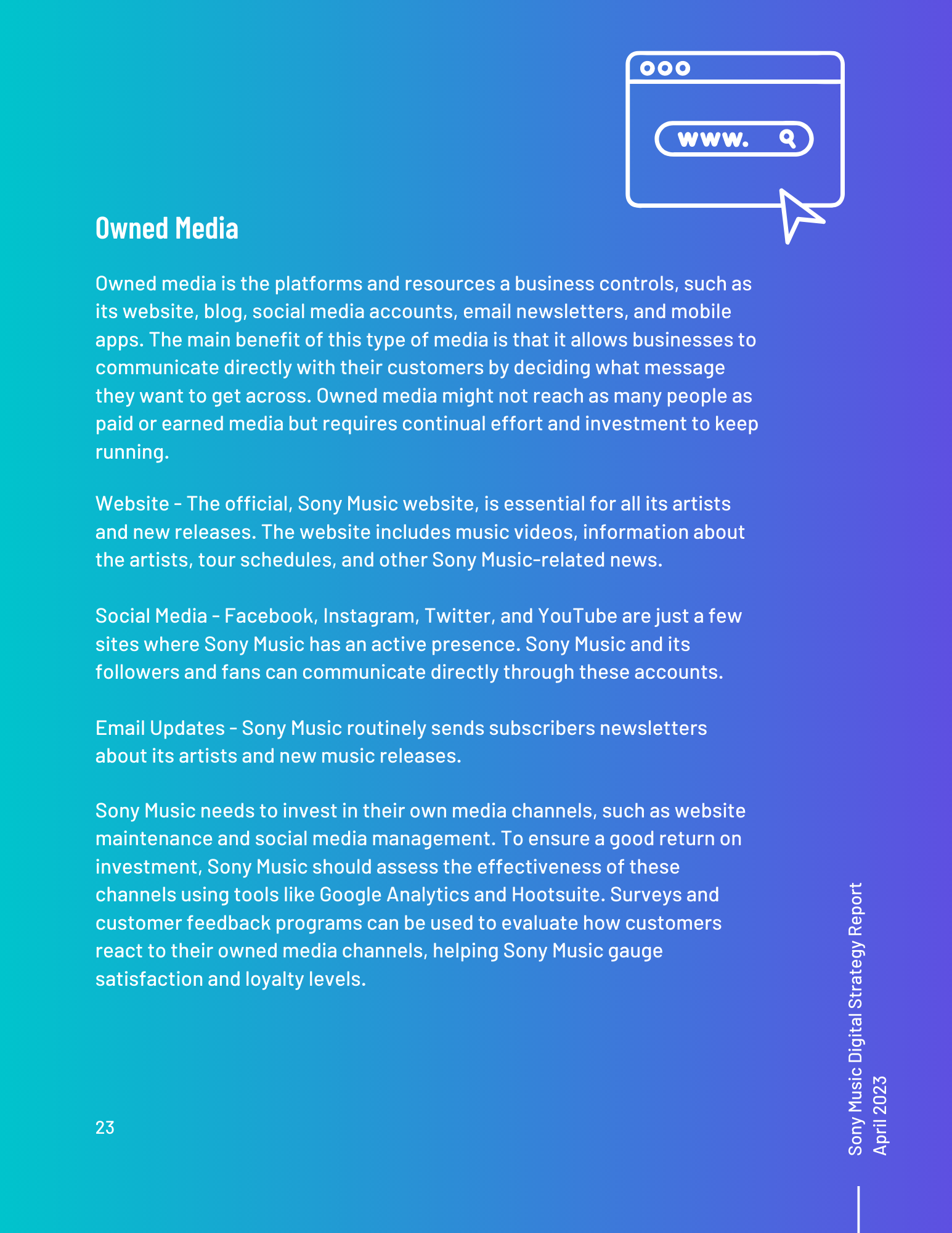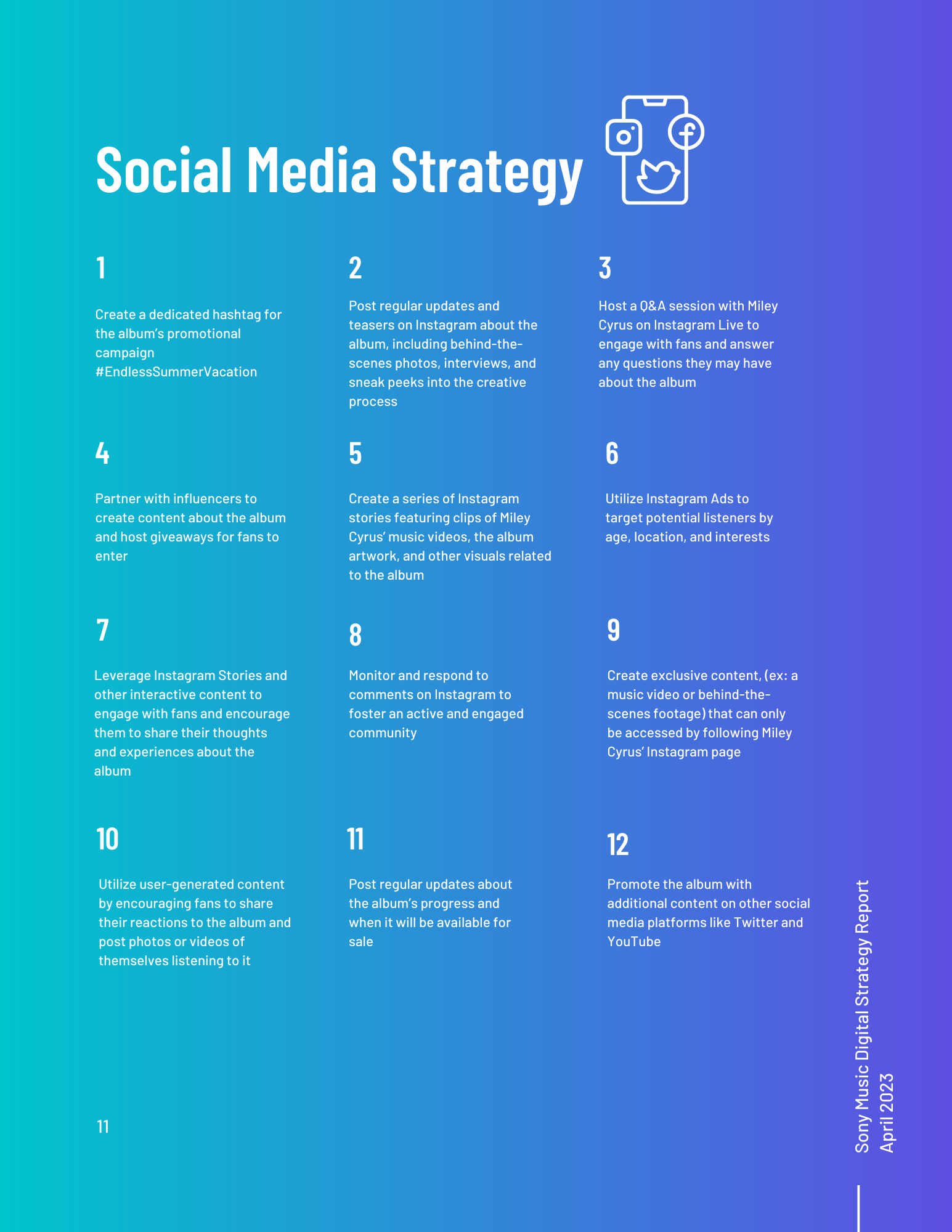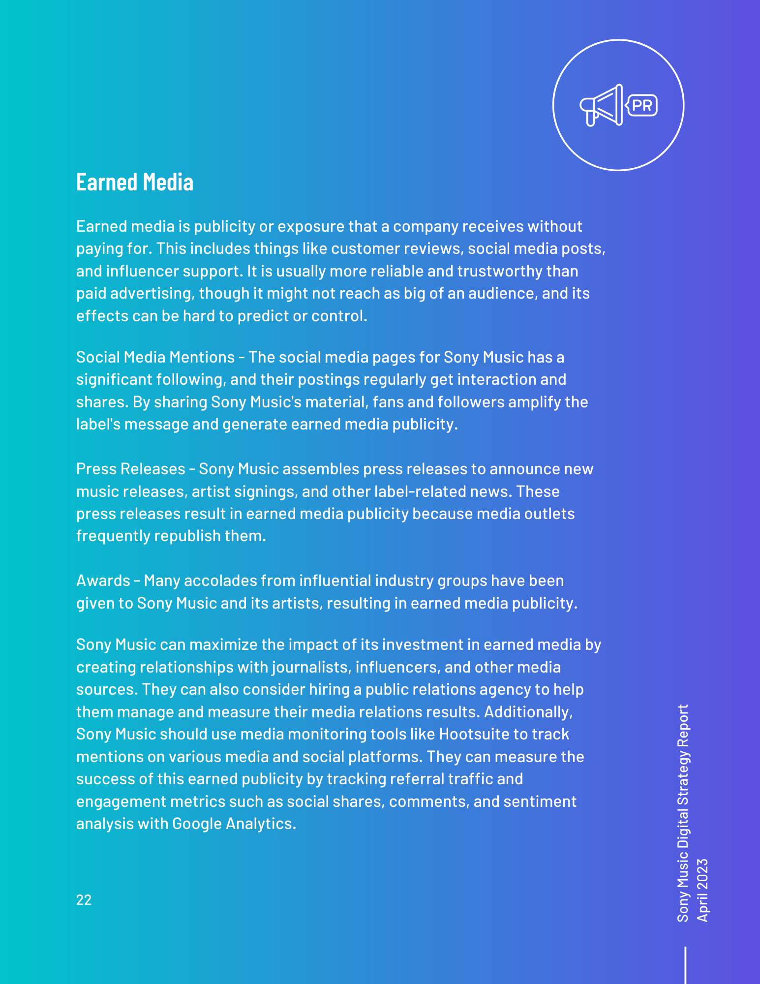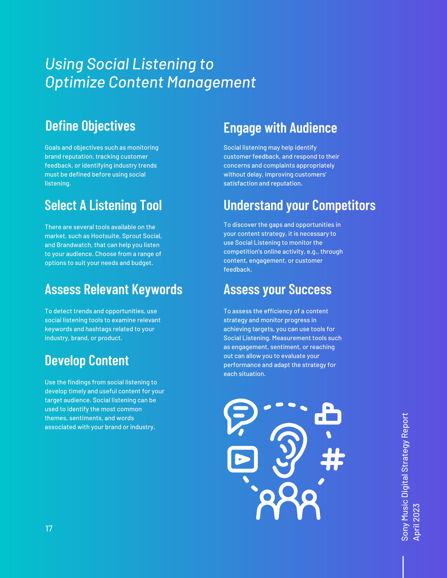 This toolkit analyzes Sony Music’s involvement in social media, SEO, digital communication channels, and other vital topics. It includes an overview of the music industry and best practices for digital strategy integration. Additionally, it offers a content calendar, three example posts for two social media platforms, and ten engagement recommendations. There is also a discussion of generative AI and its uses and seven additional tools for content management, SEO management, and social listening. Finally, key terms and recommendations on measuring ROI from initiatives such as paid placement and social media campaigns are provided.