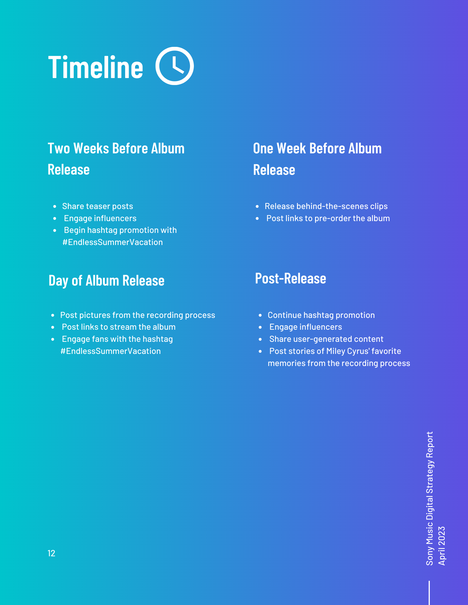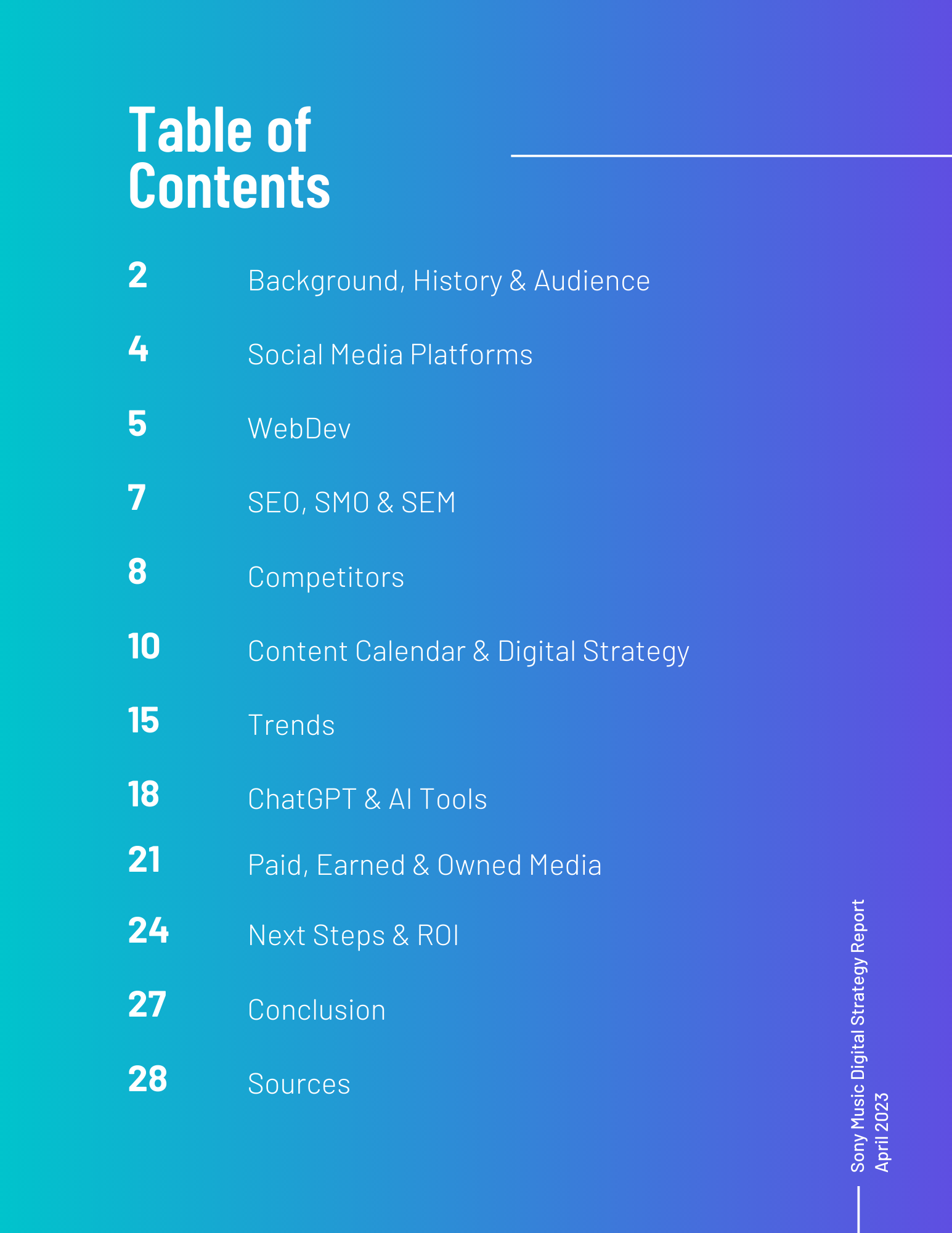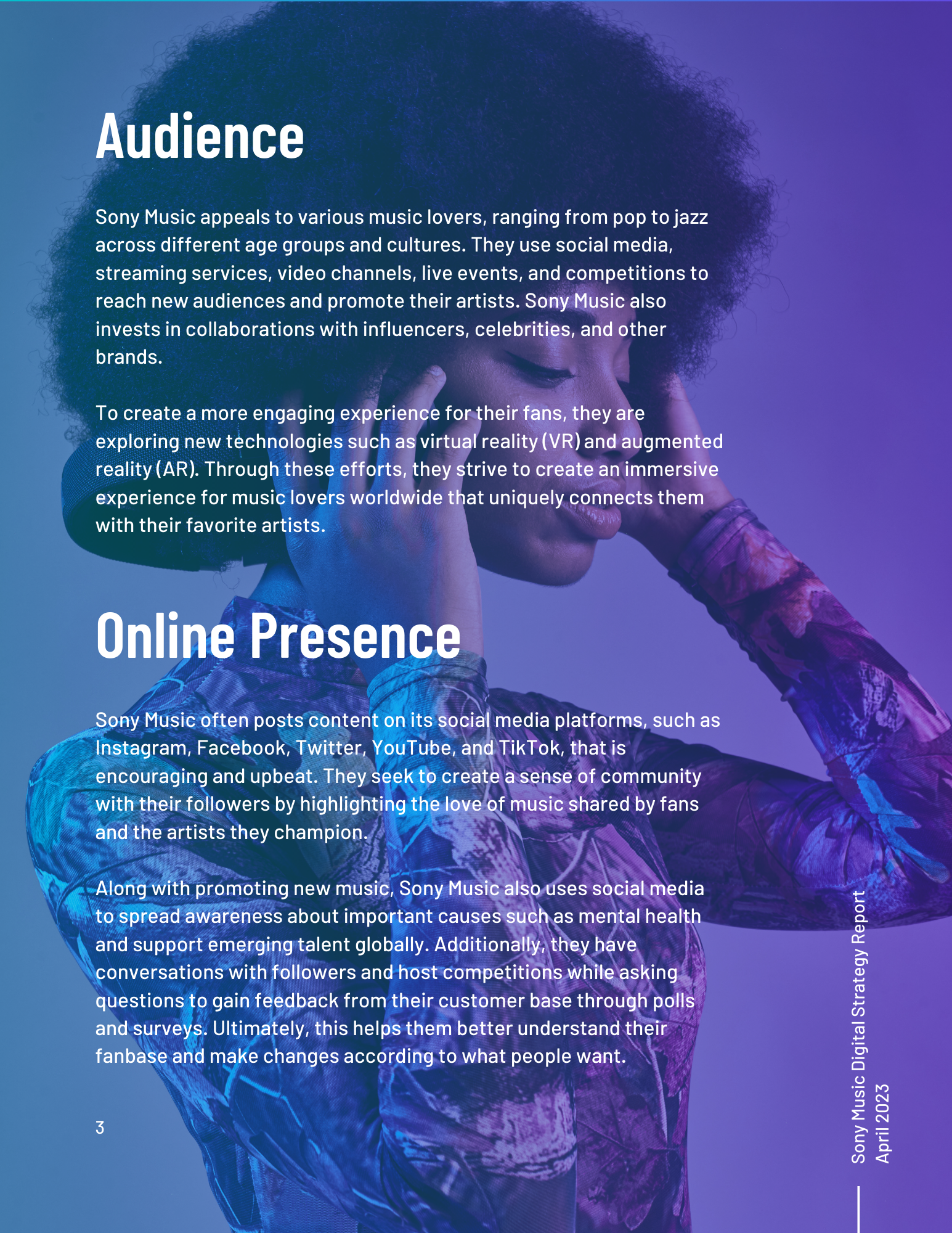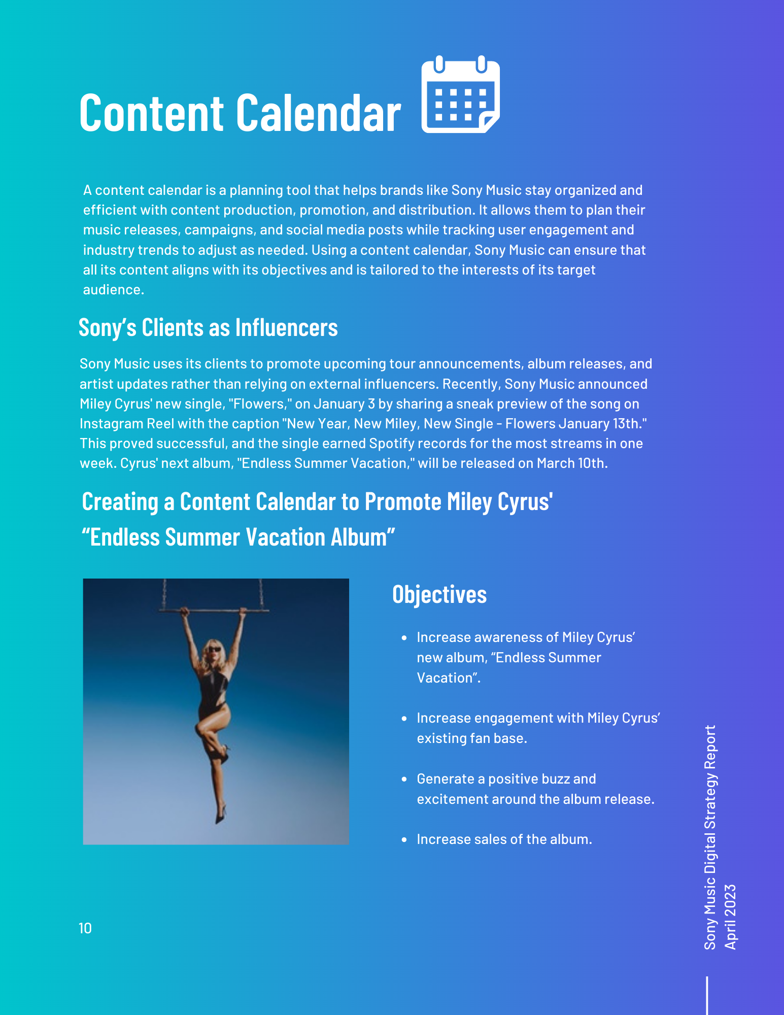 This toolkit analyzes Sony Music’s involvement in social media, SEO, digital communication channels, and other vital topics. It includes an overview of the music industry and best practices for digital strategy integration. Additionally, it offers a content calendar, three example posts for two social media platforms, and ten engagement recommendations. There is also a discussion of generative AI and its uses and seven additional tools for content management, SEO management, and social listening. Finally, key terms and recommendations on measuring ROI from initiatives such as paid placement and social media campaigns are provided.