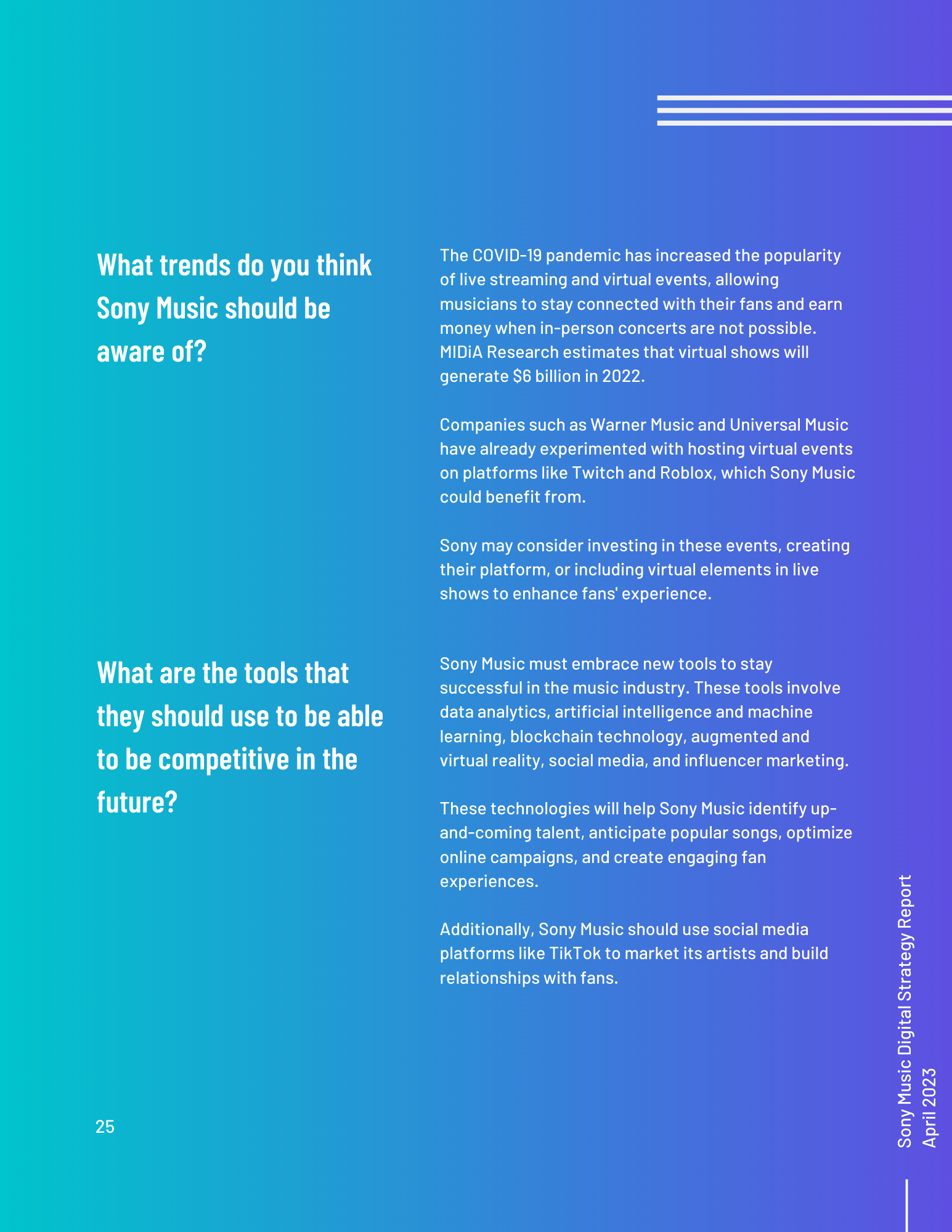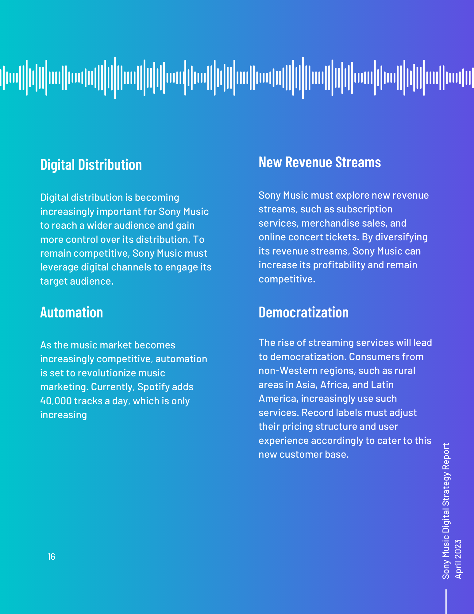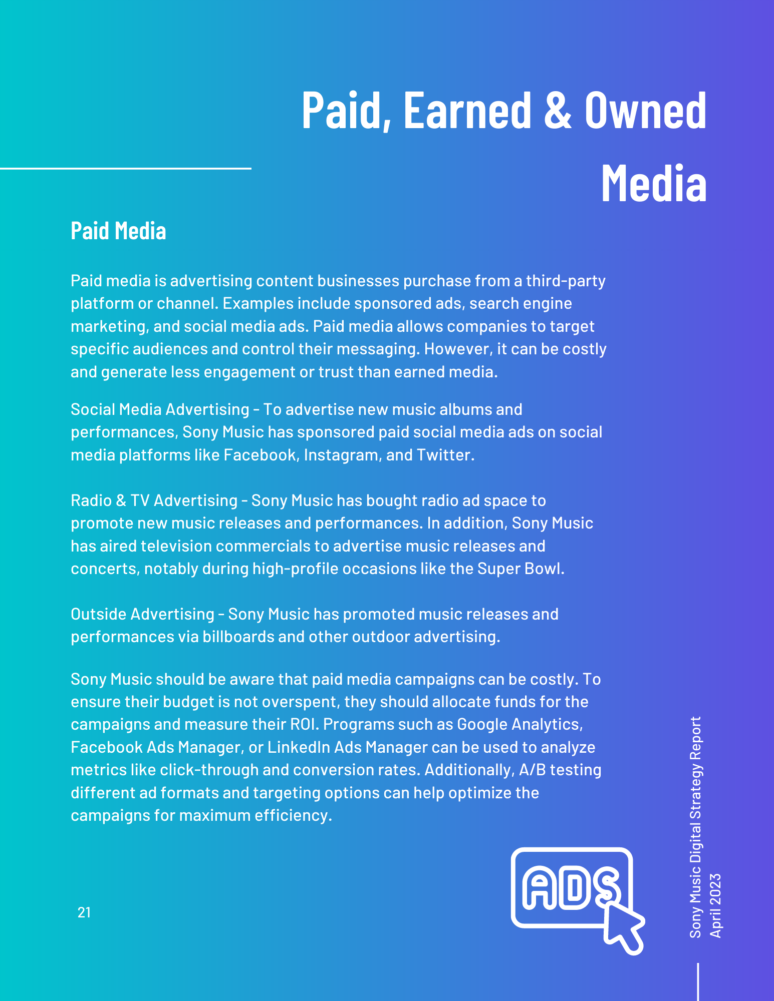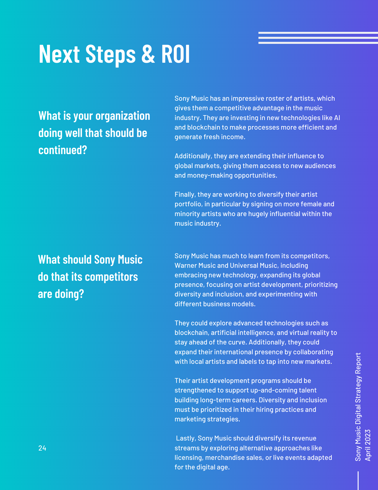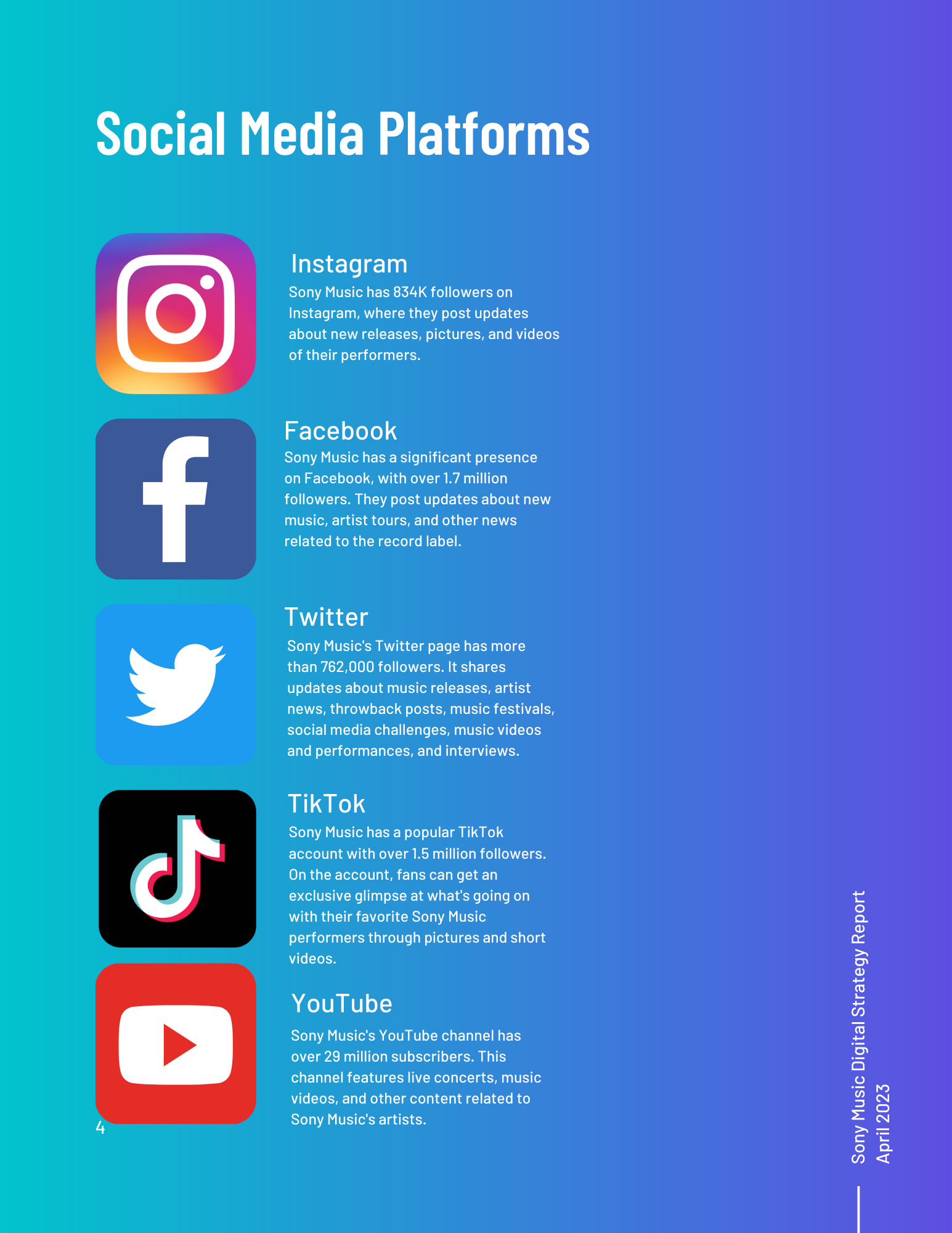 This toolkit analyzes Sony Music’s involvement in social media, SEO, digital communication channels, and other vital topics. It includes an overview of the music industry and best practices for digital strategy integration. Additionally, it offers a content calendar, three example posts for two social media platforms, and ten engagement recommendations. There is also a discussion of generative AI and its uses and seven additional tools for content management, SEO management, and social listening. Finally, key terms and recommendations on measuring ROI from initiatives such as paid placement and social media campaigns are provided.