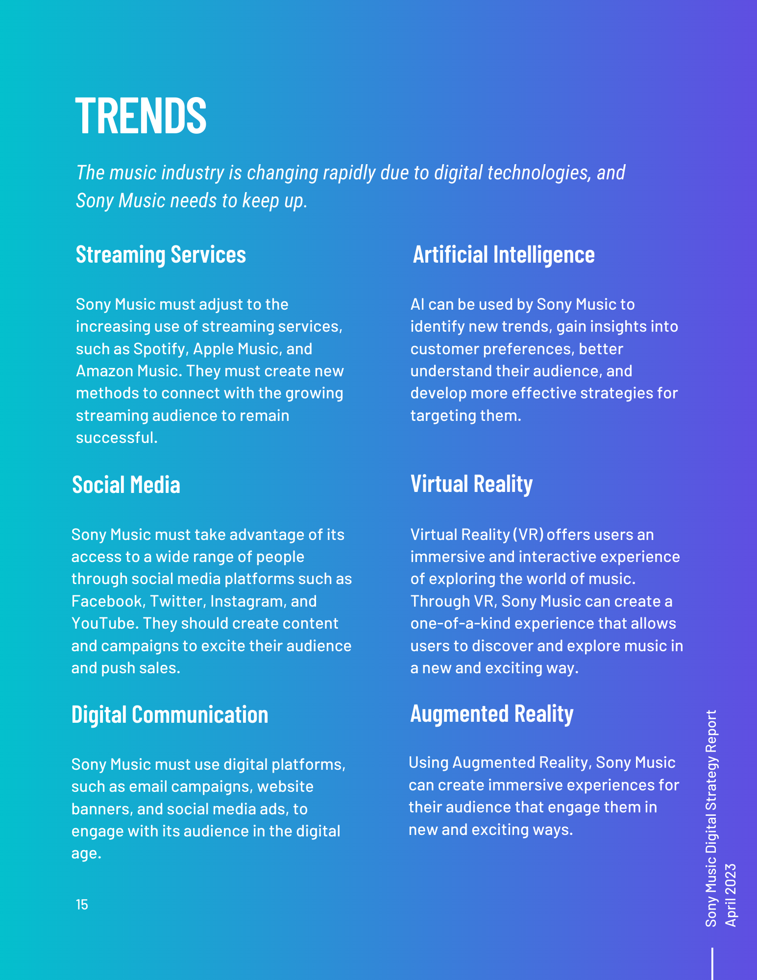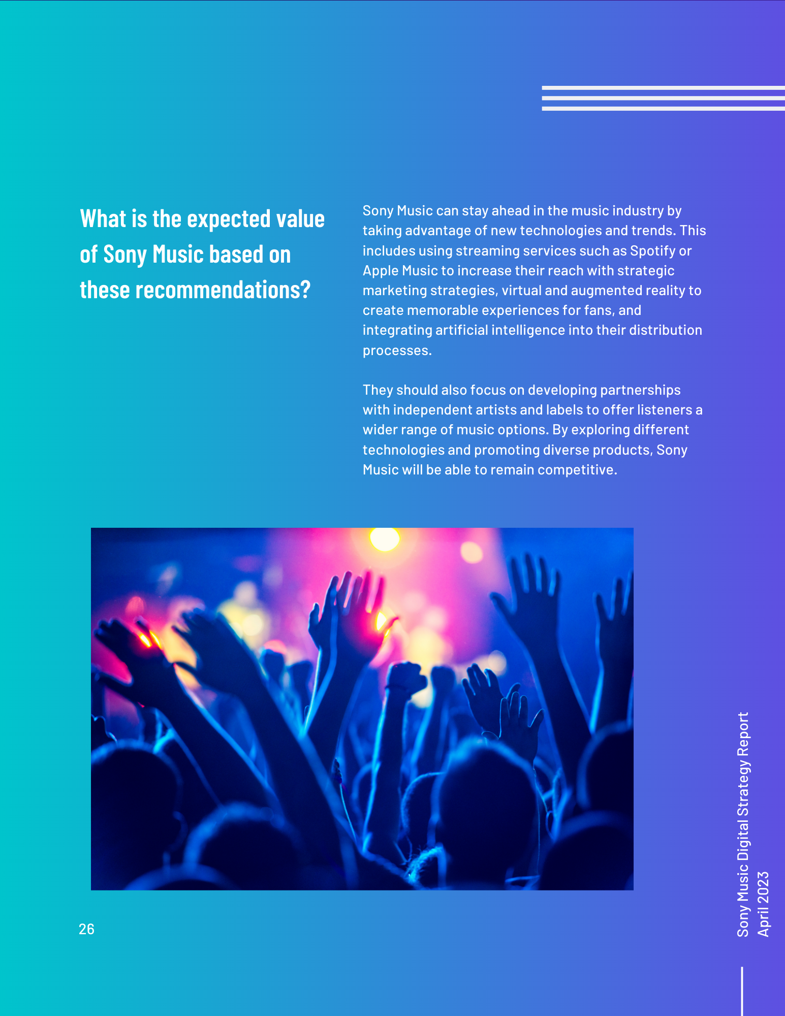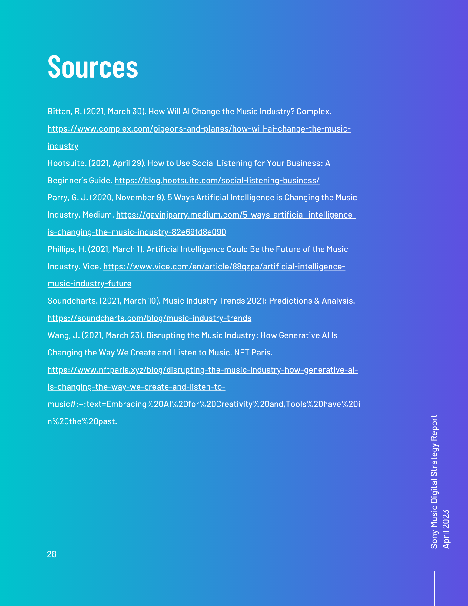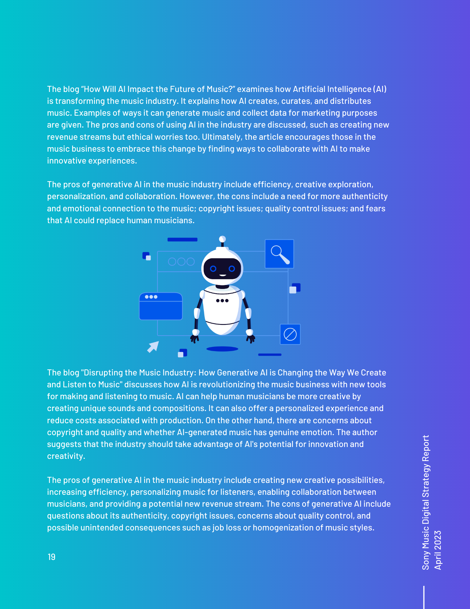 This toolkit analyzes Sony Music’s involvement in social media, SEO, digital communication channels, and other vital topics. It includes an overview of the music industry and best practices for digital strategy integration. Additionally, it offers a content calendar, three example posts for two social media platforms, and ten engagement recommendations. There is also a discussion of generative AI and its uses and seven additional tools for content management, SEO management, and social listening. Finally, key terms and recommendations on measuring ROI from initiatives such as paid placement and social media campaigns are provided.