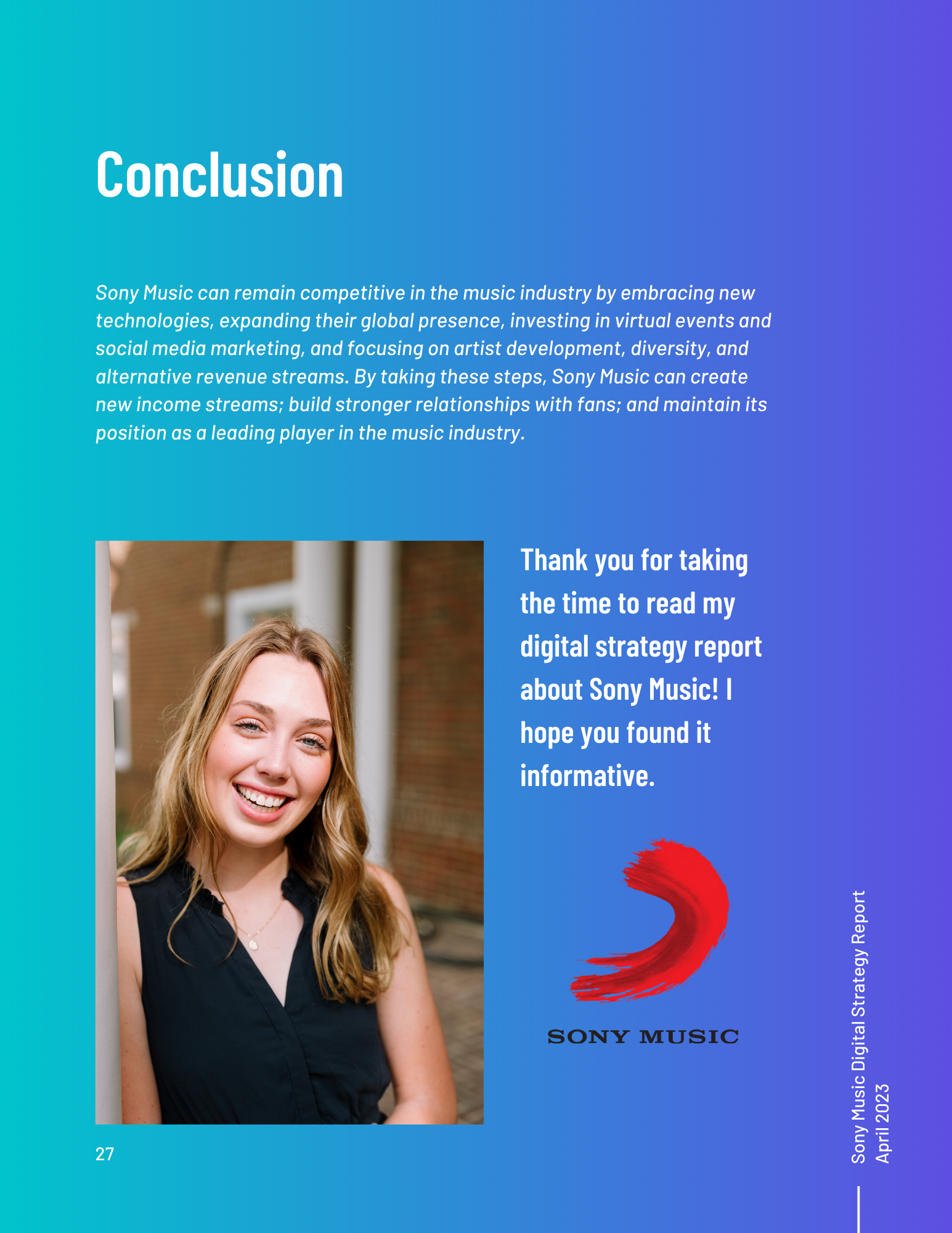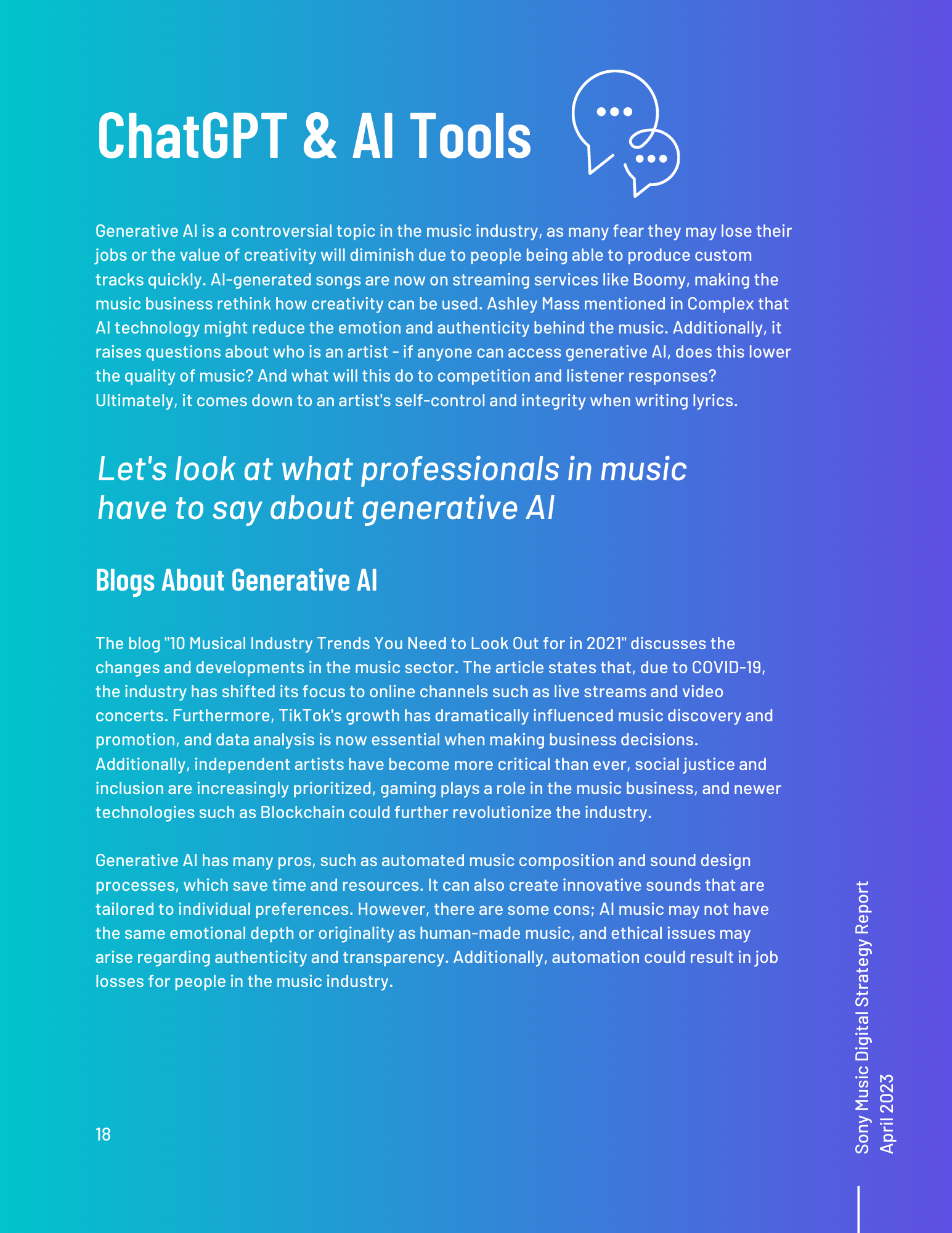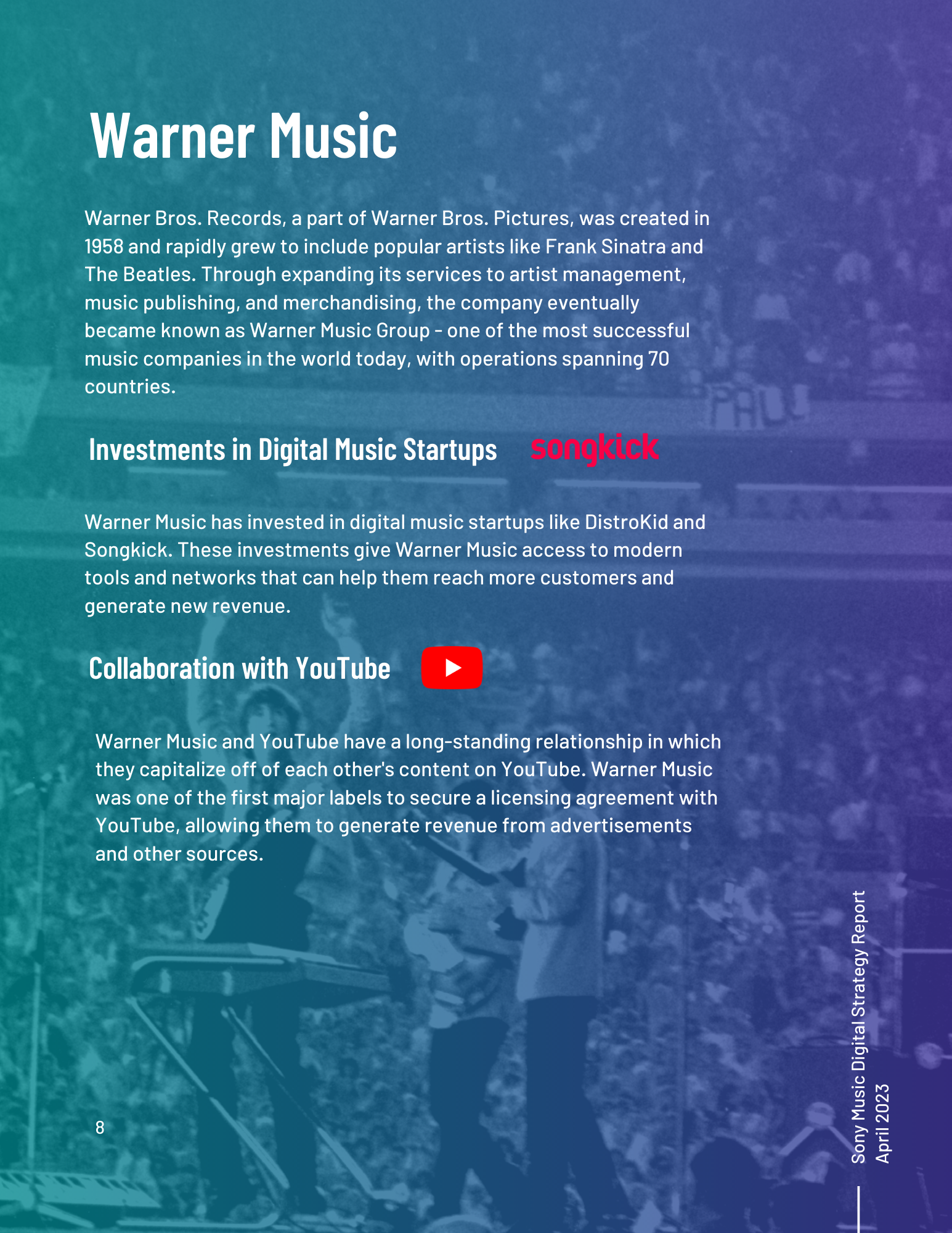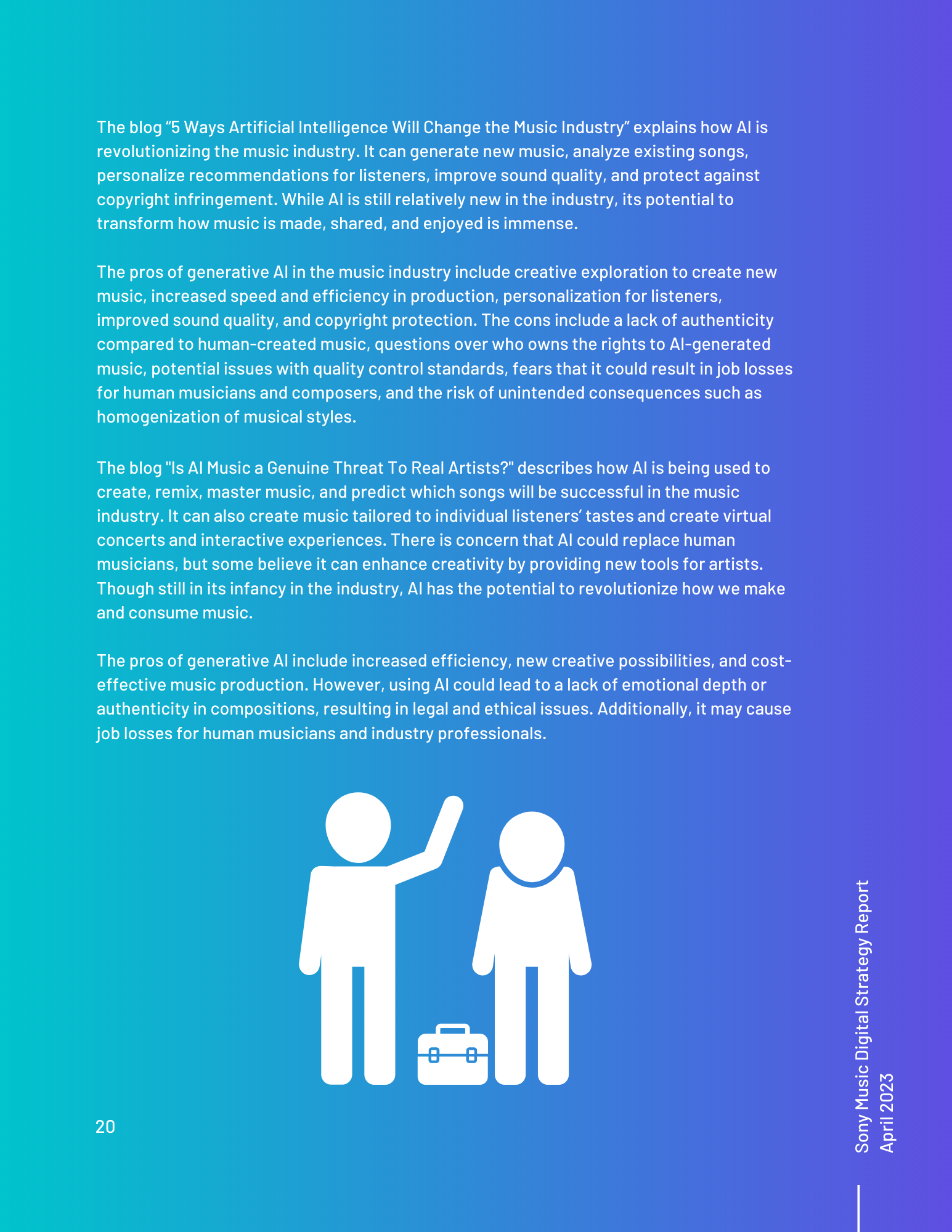 This toolkit analyzes Sony Music’s involvement in social media, SEO, digital communication channels, and other vital topics. It includes an overview of the music industry and best practices for digital strategy integration. Additionally, it offers a content calendar, three example posts for two social media platforms, and ten engagement recommendations. There is also a discussion of generative AI and its uses and seven additional tools for content management, SEO management, and social listening. Finally, key terms and recommendations on measuring ROI from initiatives such as paid placement and social media campaigns are provided.
