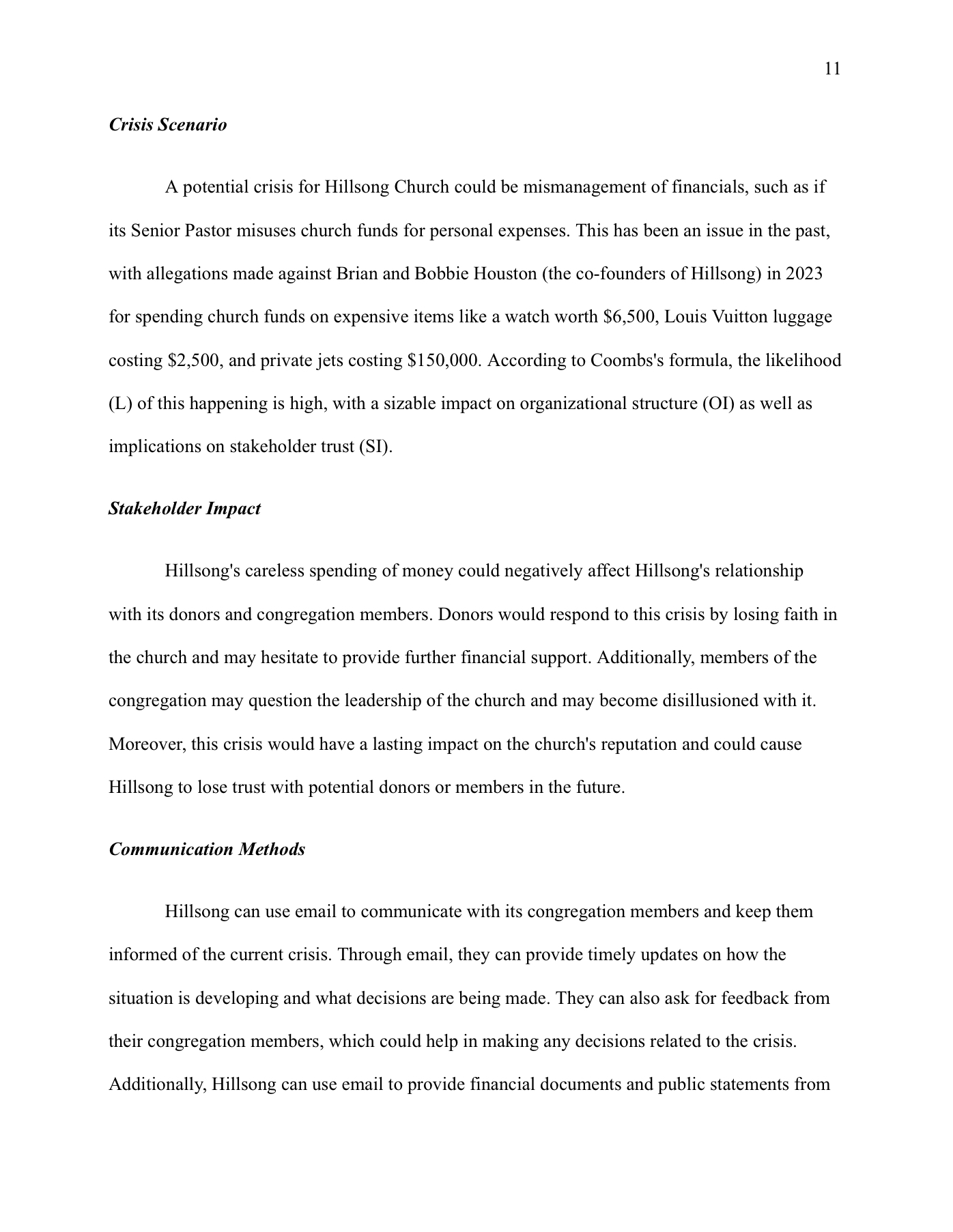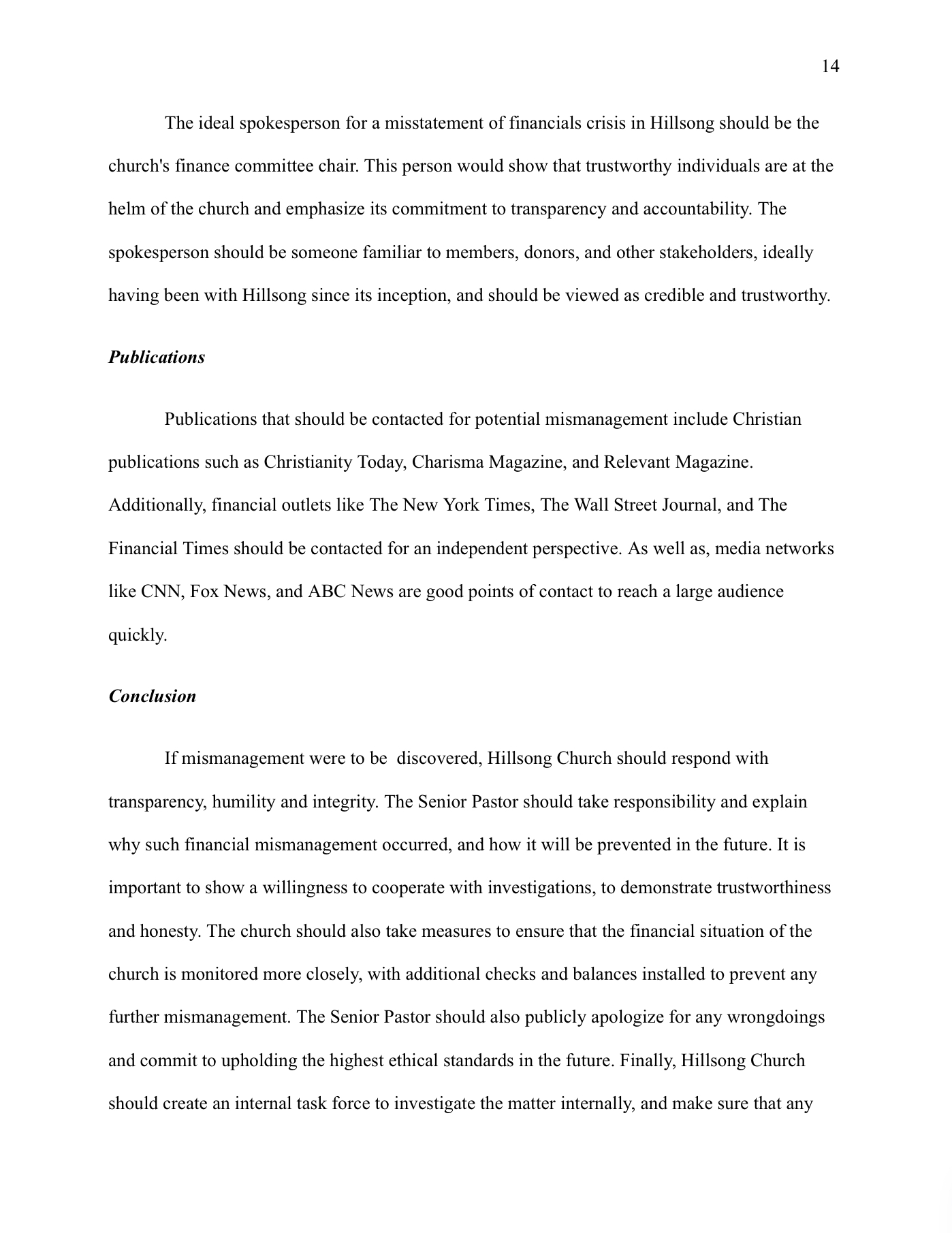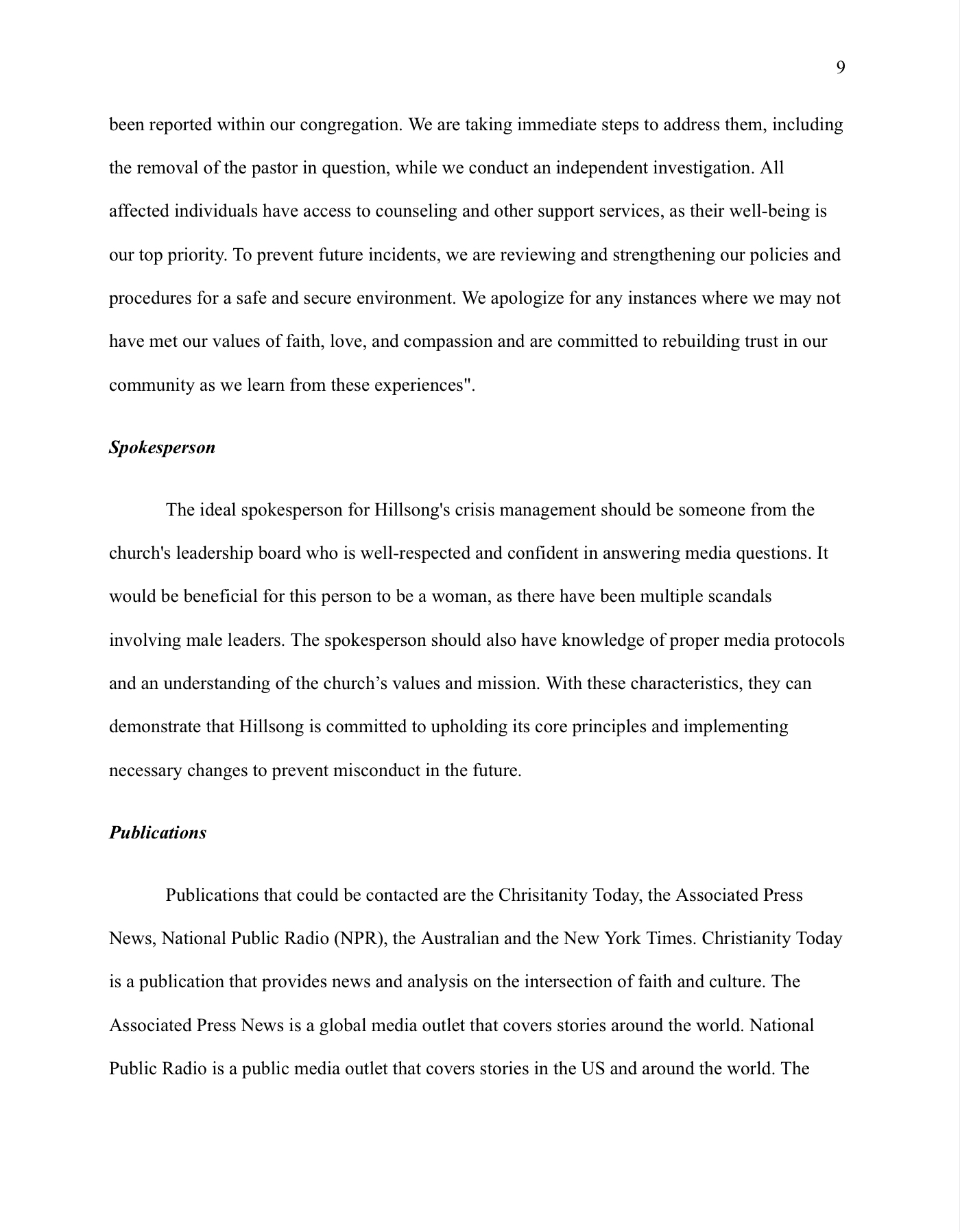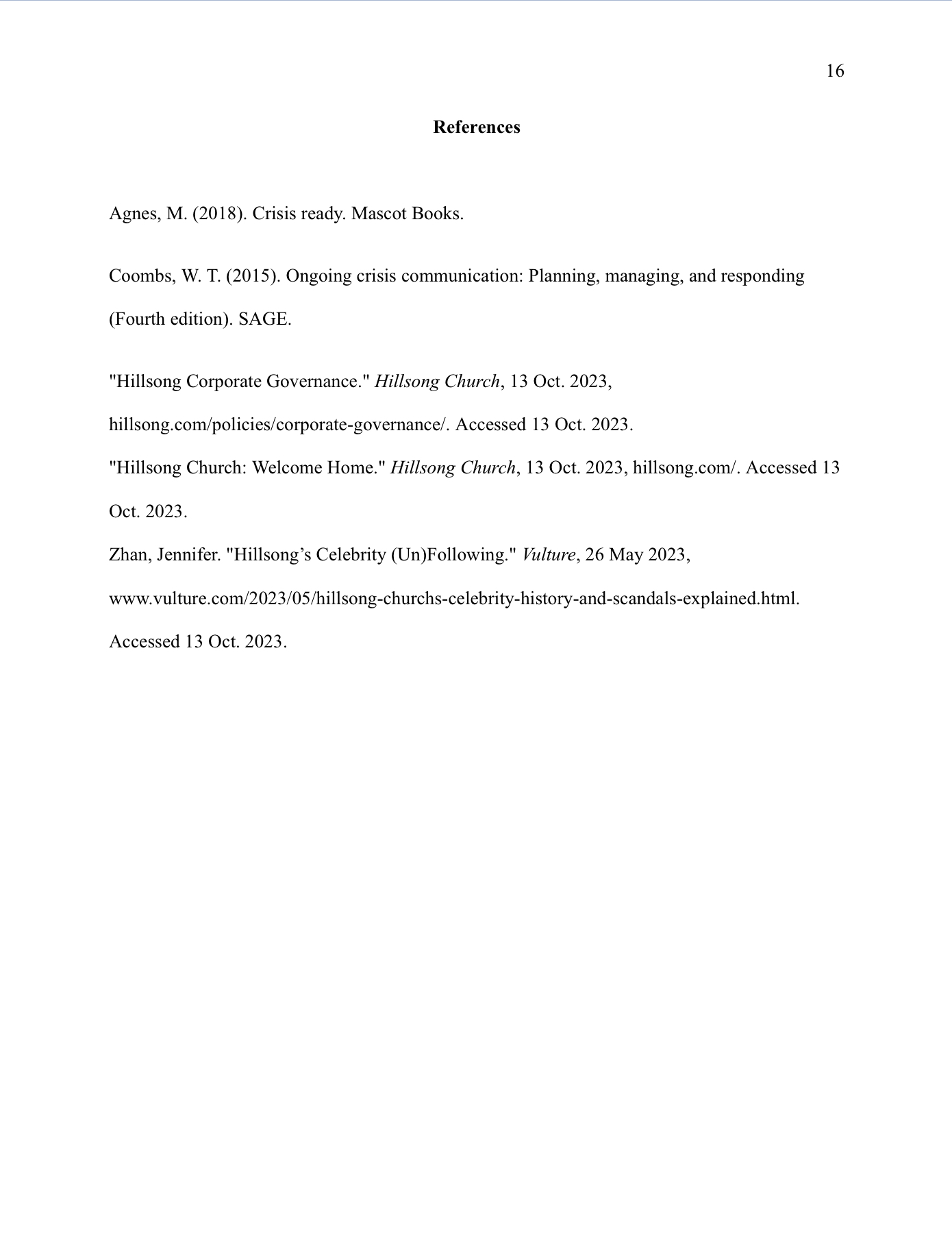 In Professor Brenda V. Ross‘ course on Crisis Communication and Reputation Management, we developed a Crisis Portfolio that outlines a comprehensive crisis plan for an organization of our choice. For my Crisis Portfolio, I chose Hillsong Church, unpacking its background, potential crises, stakeholders, communication strategies, ideal spokespersons, and response plans. I’m thankful to Brenda V. Ross for guiding me through this portfolio! She showed me what it means to think like a PR professional – to be empathetic, think outside of the box, and develop effective and efficient strategies to manage a crisis if/when it arises.