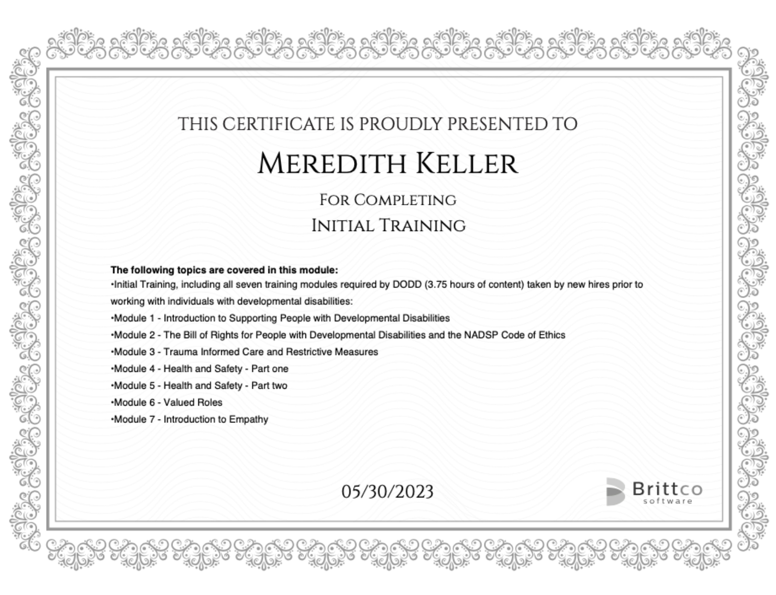 Gained valuable knowledge about the rights of individuals with developmental disabilities, ethical guidelines, trauma-informed care, health and safety precautions, fostering valued roles, and cultivating empathy.