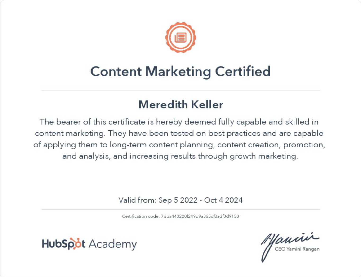Hubspot Academy’s Certificate in Content Media Marketing (September 2022)