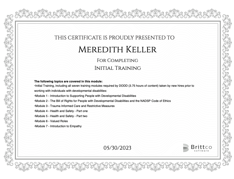Gained valuable knowledge about the rights of individuals with developmental disabilities, ethical guidelines, trauma-informed care, health and safety precautions, fostering valued roles, and cultivating empathy.