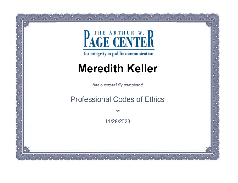 The Arthur W. Page Center Certification in Professional Codes of Ethics (November 2023)