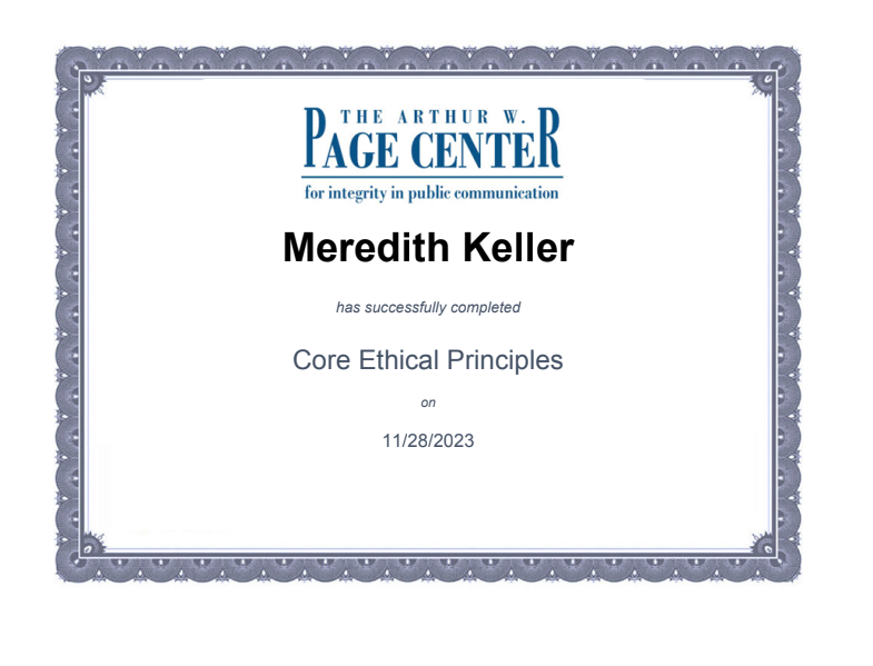 The Arthur W. Page Center Certification in Core Ethical Principles (November 2023)