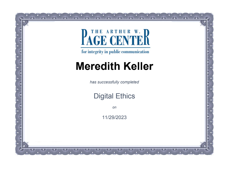 The Arthur W. Page Center Certification in Digital Ethics (November 2023)