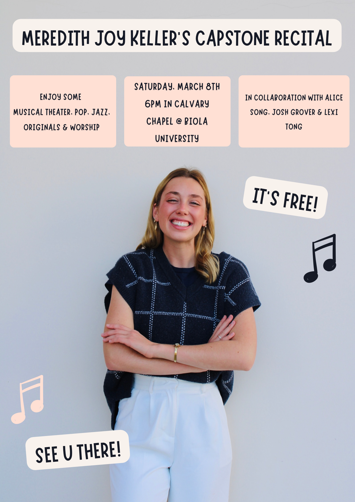After four amazing years of studying music at Biola, I was thrilled to present my capstone recital! It featured a mix of musical theater, pop, jazz, worship, and even some of my original songs. It was a fun and unforgettable evening, and I was so grateful to have many of you there — plus, it was free! Thank you for bringing your friends and family and for all your prayers as I prepared for this special concert. Much love!